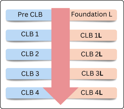 CLB: ESL for ALL provides guidance to instructors of EAL literacy learners, whether they are teaching a dedicated EAL literacy class, or a course with both literate and EAL literacy learners. It outlines five levels of ability: Foundation L, and CLB 1L-CLB 4L. Foundation L learners have not yet met the requirements for CLB 1, and need to learn the basics of reading and writing, such as recognizing the letters of the alphabet, numbers 1-10, their own name and a few sight words. For CLB 1L-4L, learners work towards the same CLB outcomes as literate learners, but generally at a slower pace and with much more support, instruction and repeated practice of EAL literacy skills. For each level, ESL for ALL lists the characteristics and skill gaps a EAL literacy learner may demonstrate, as well as examples of activities to address those skill gaps.